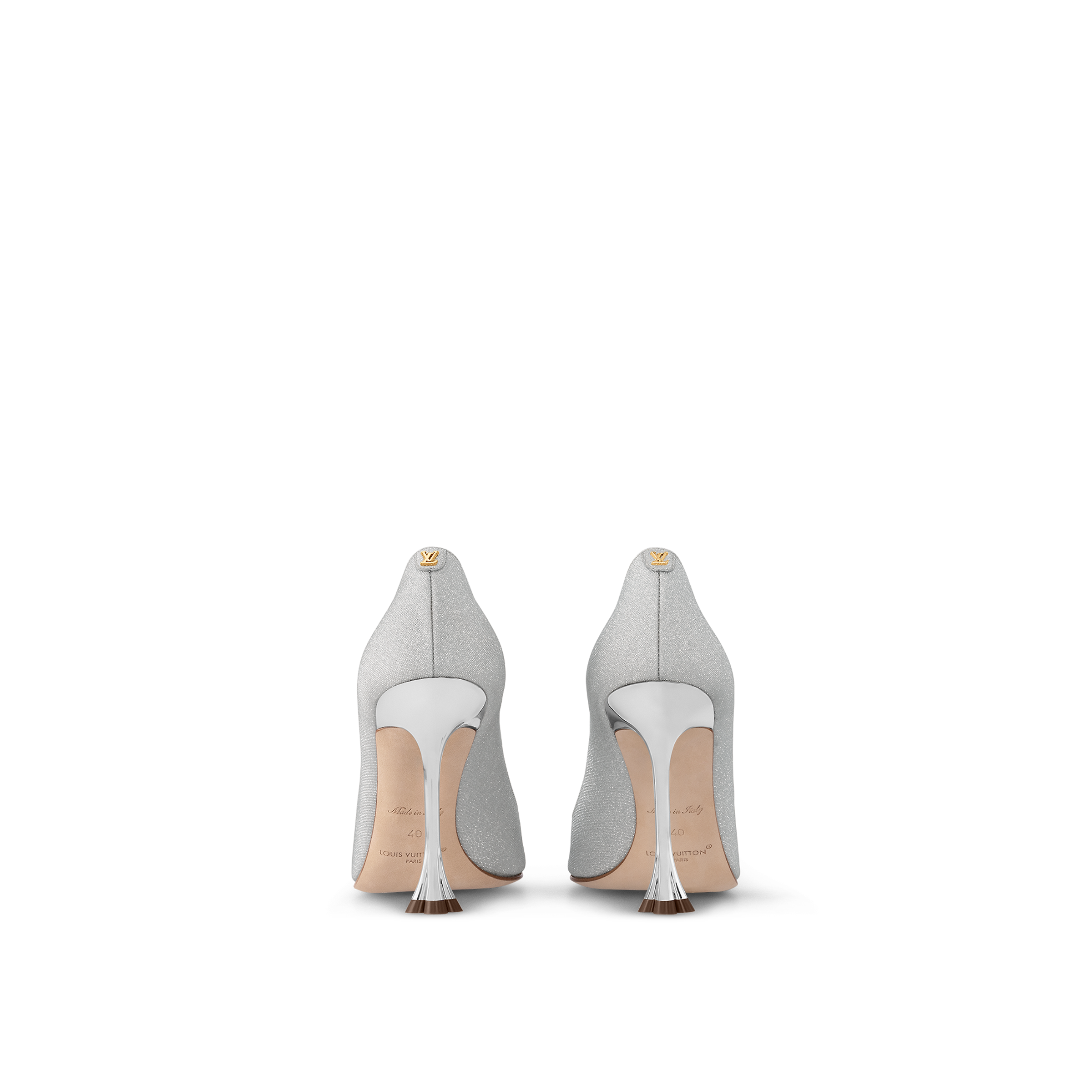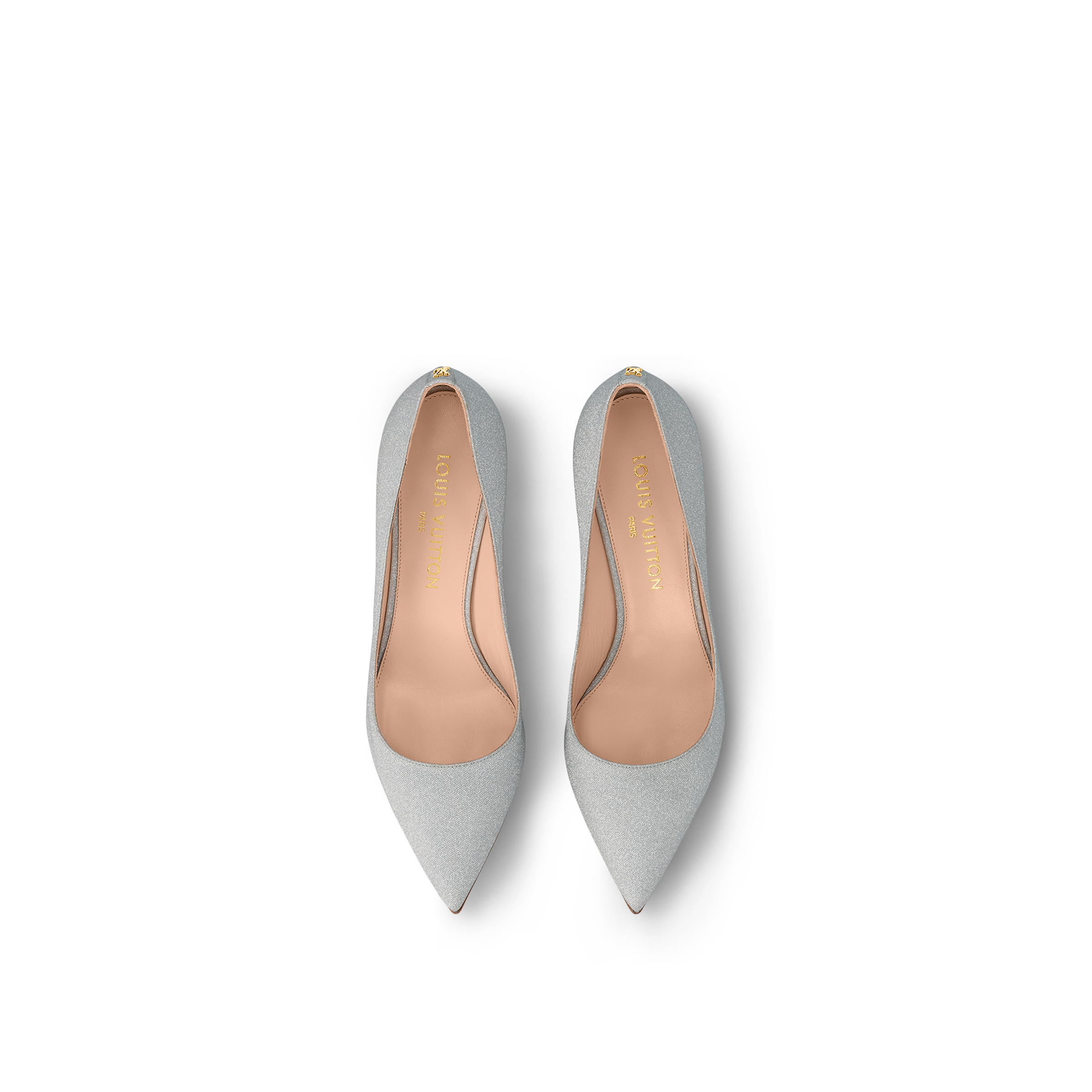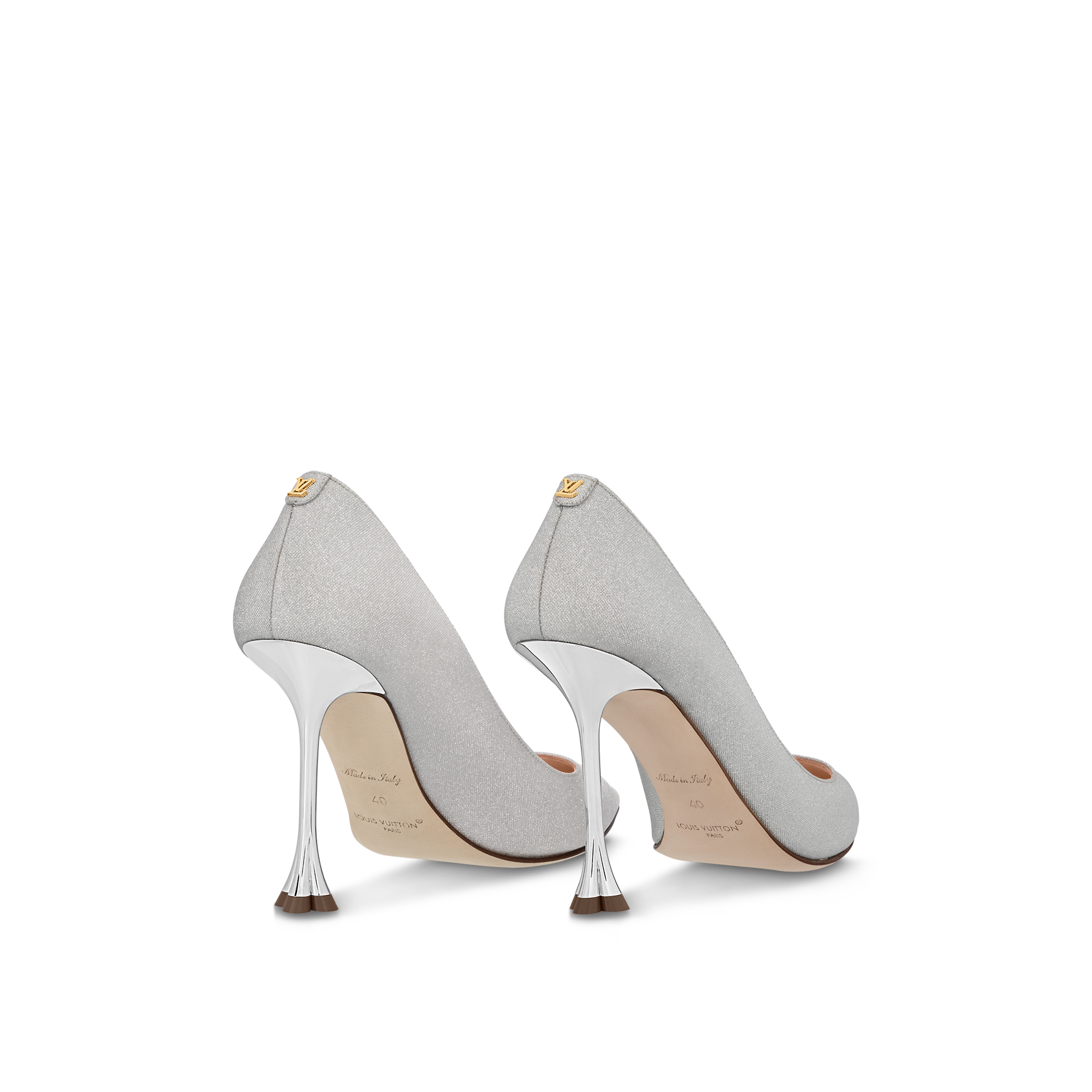 Shimmering silver textile complements the elegant lines of the Blossom Pumps. This model is distinguished by its feminine pointed toe and high heel inspired by Louis Vuitton's iconic round Monogram Flower. A fine leather outsole and padded insole complete this design, which is signed with an LV Initials stud at the back.
