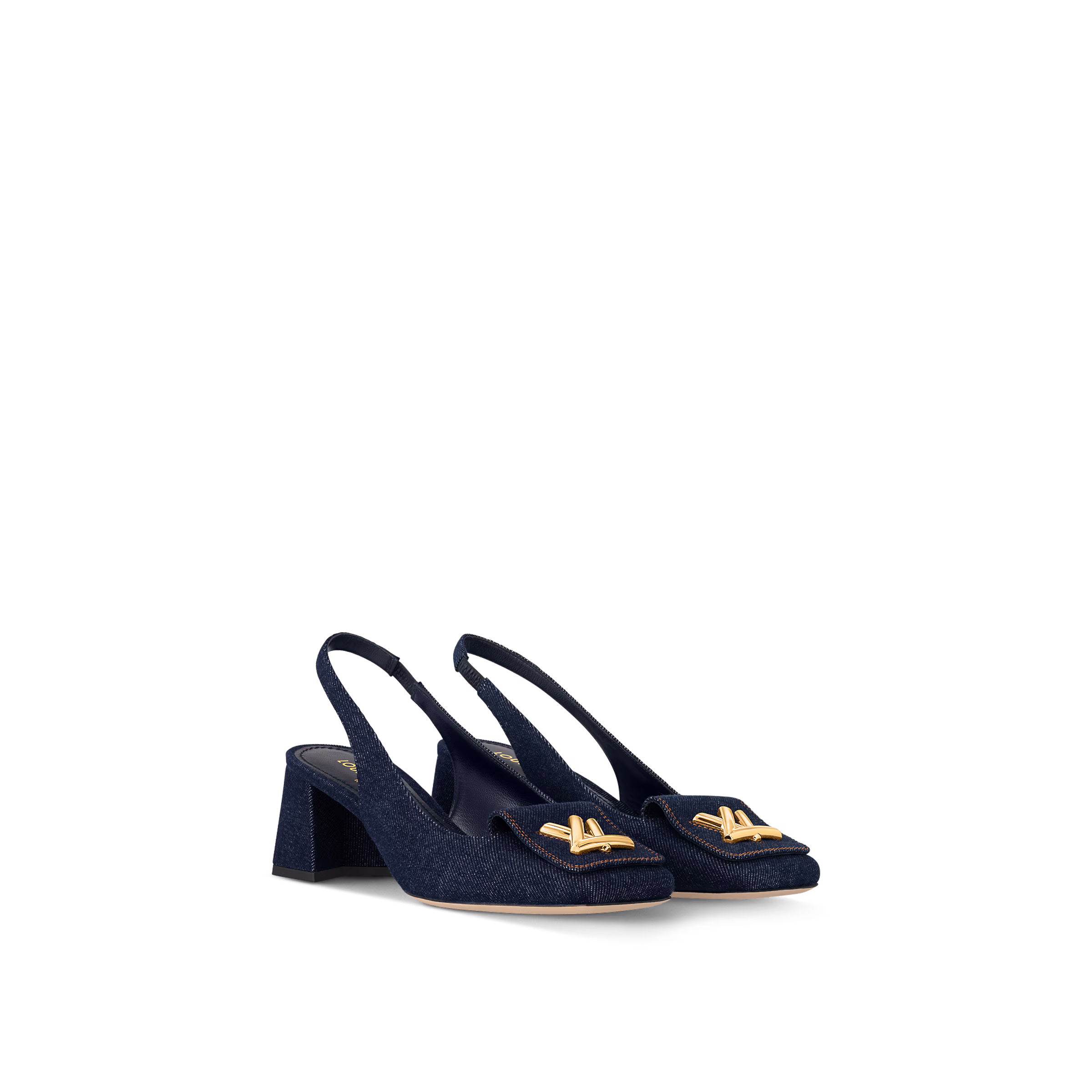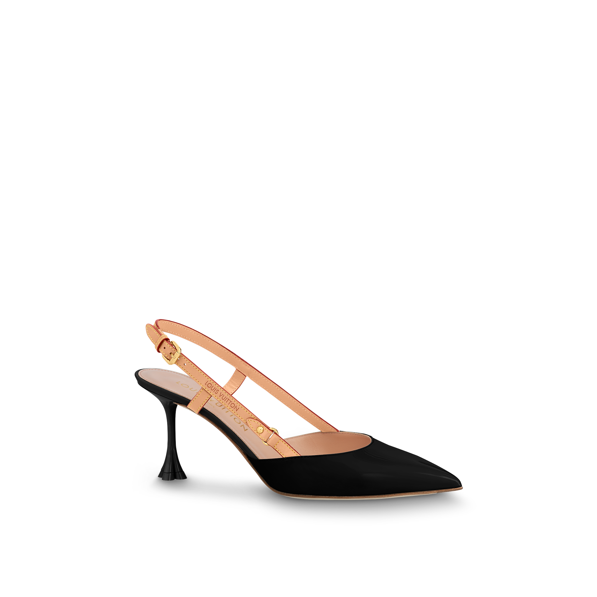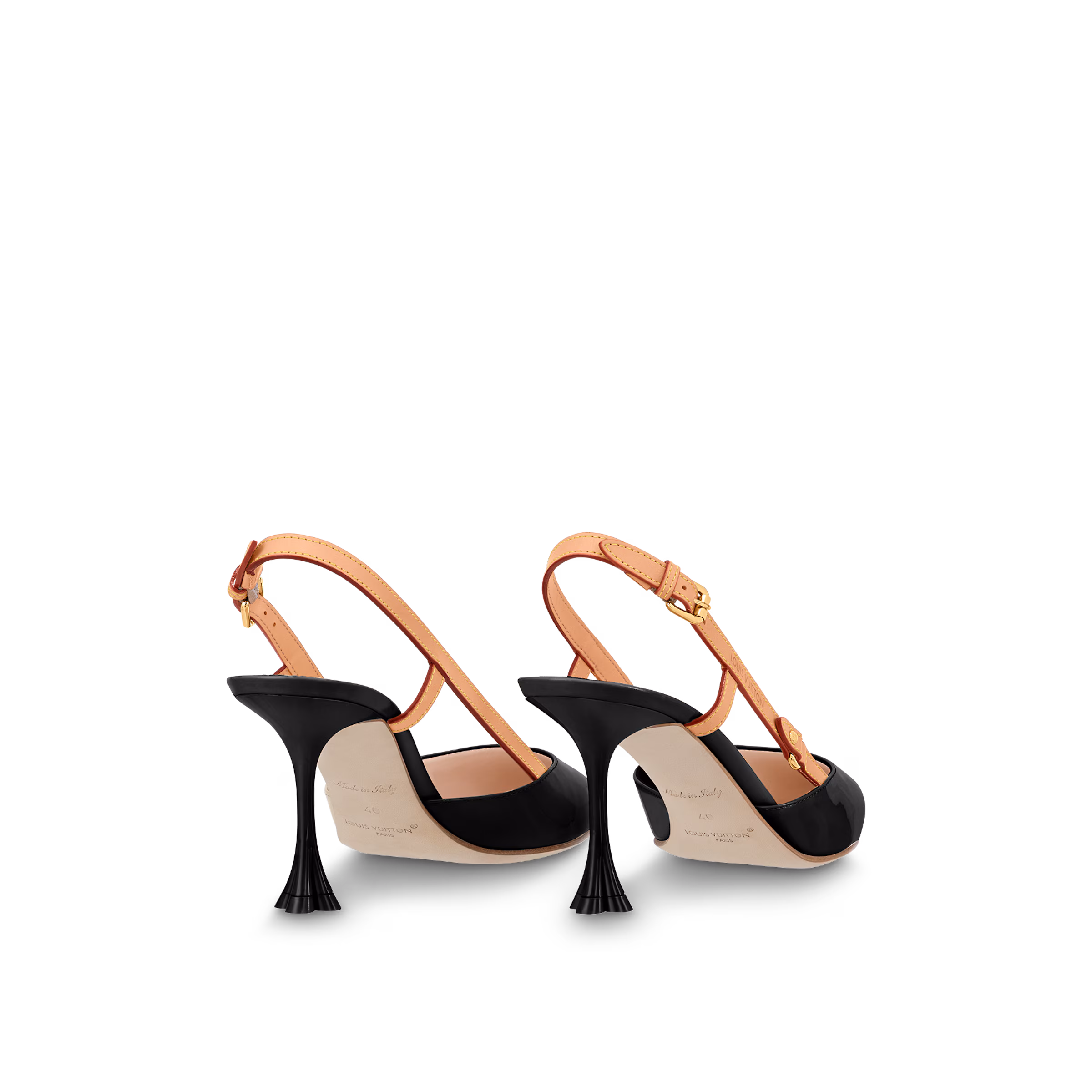 These Blossom Slingbacks contrast uppers in high-shine patent calf leather with natural leather straps bearing the Louis Vuitton signature. This model is notable for its graceful heel in the shape of a round Monogram Flower. The back strap is embellished with an engraved, gold-colour stud and adjusted with a tiny buckle.