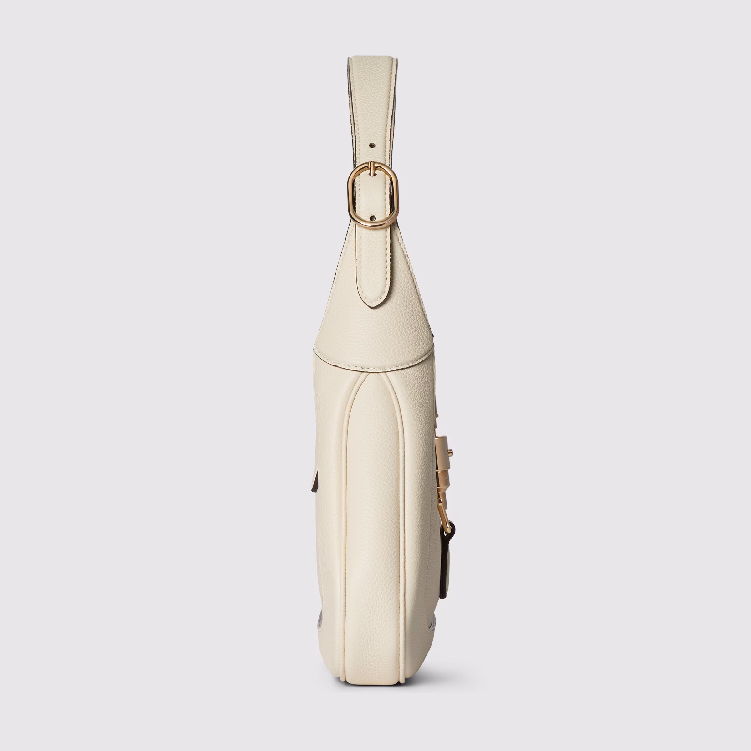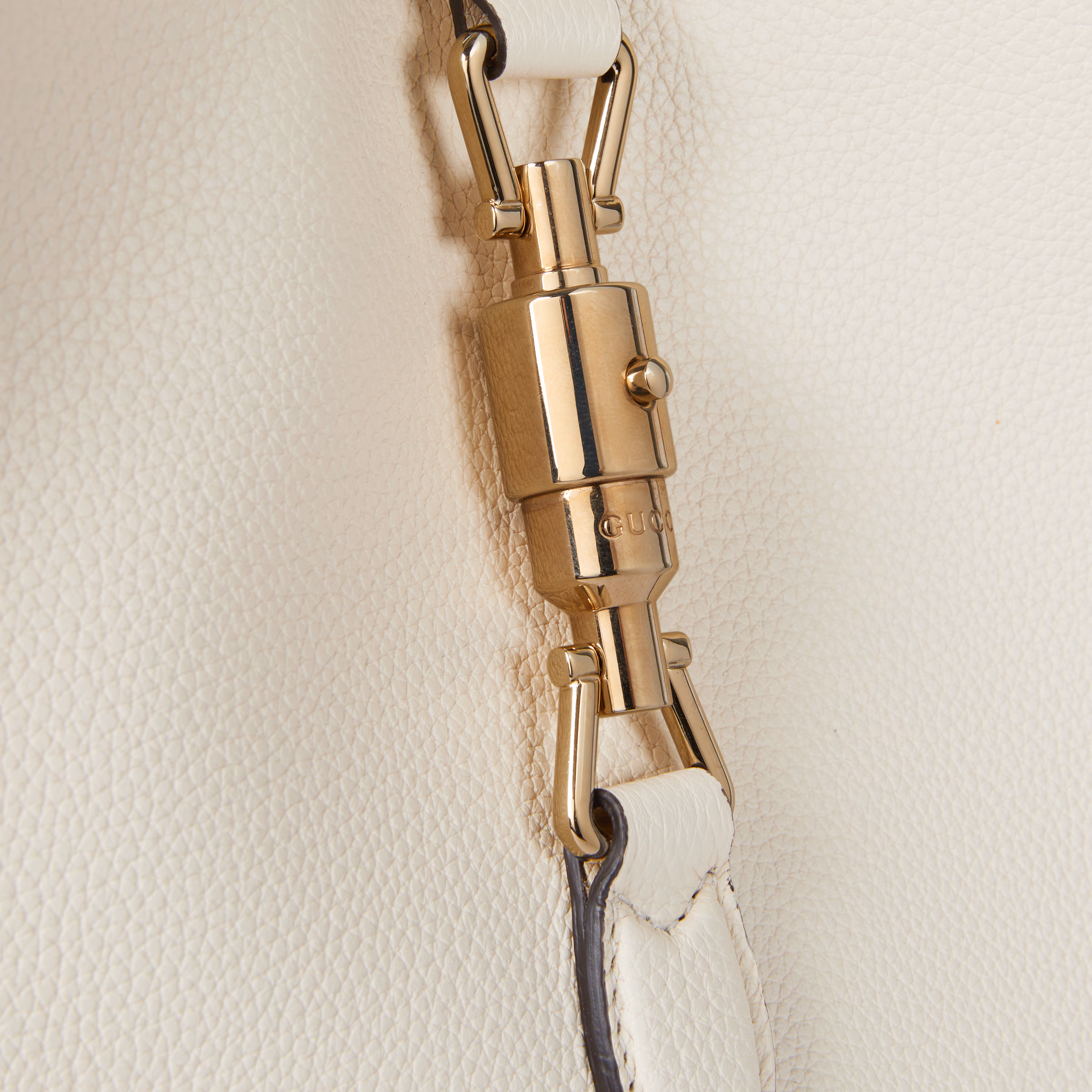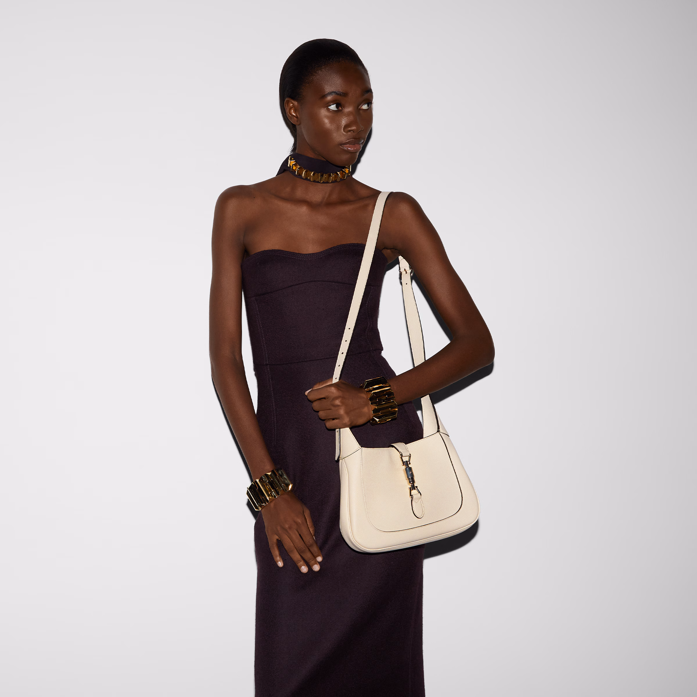 In the Fall Winter 2024 collection, the Gucci Jackie 1961 shoulder bag with new light gold-toned piston closure features fine ivory leather, highlighting the craftsmanship, crescent shape, and sleek silhouette of the House's iconic handbag. This small size comes with a leather strap and additional green and red Web strap for different styling options.