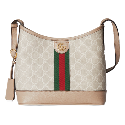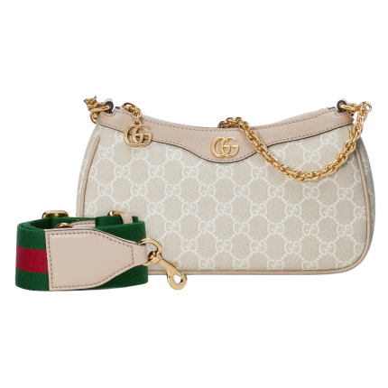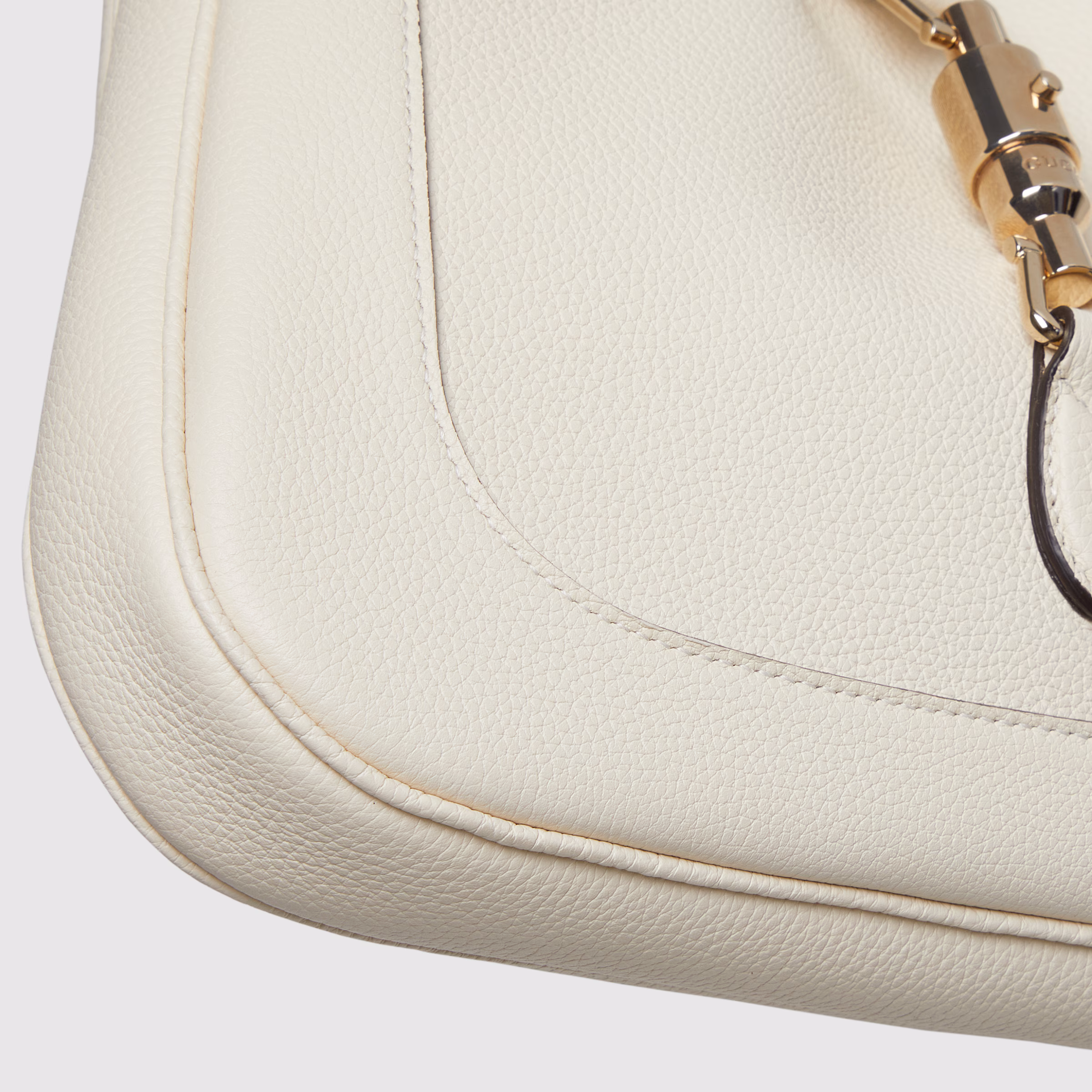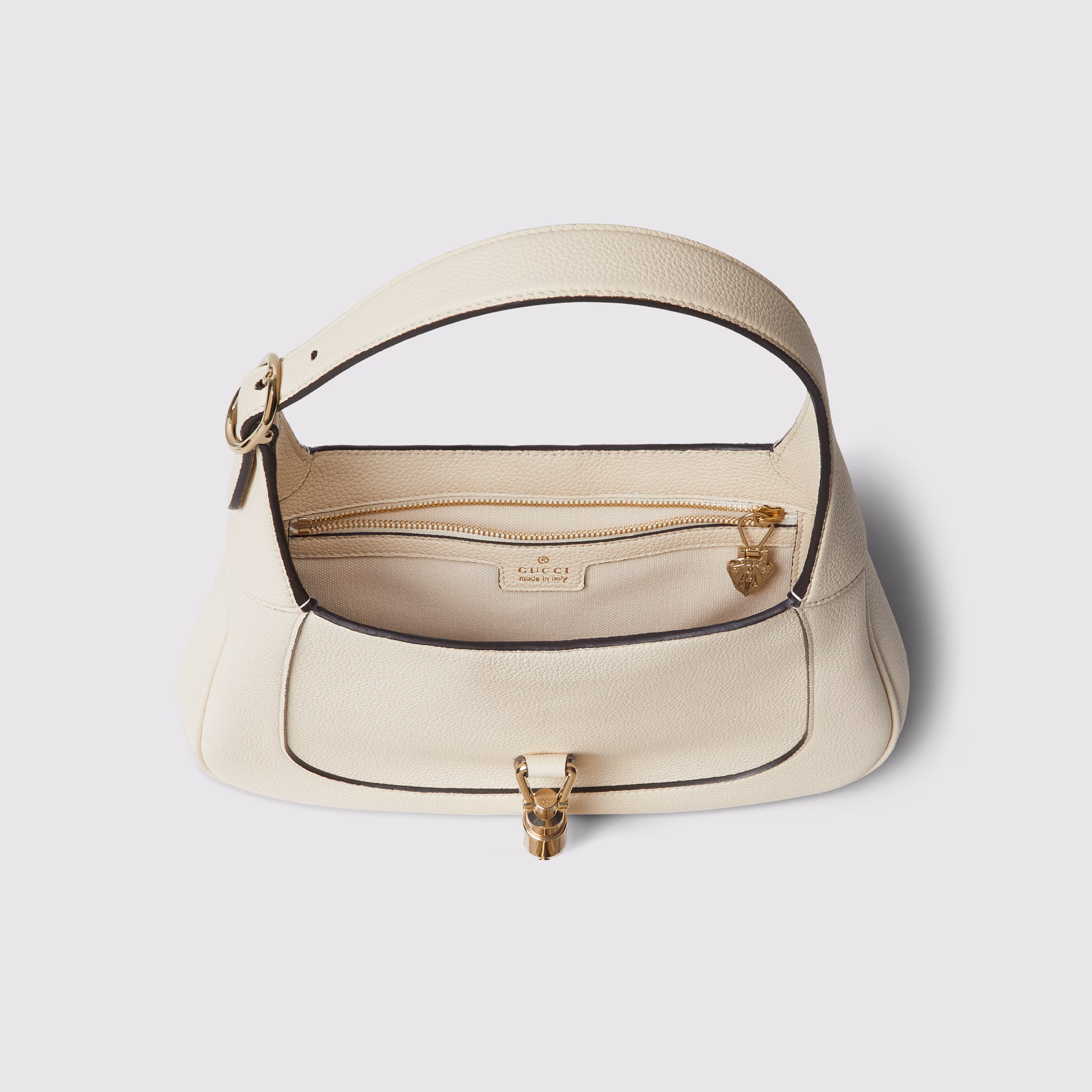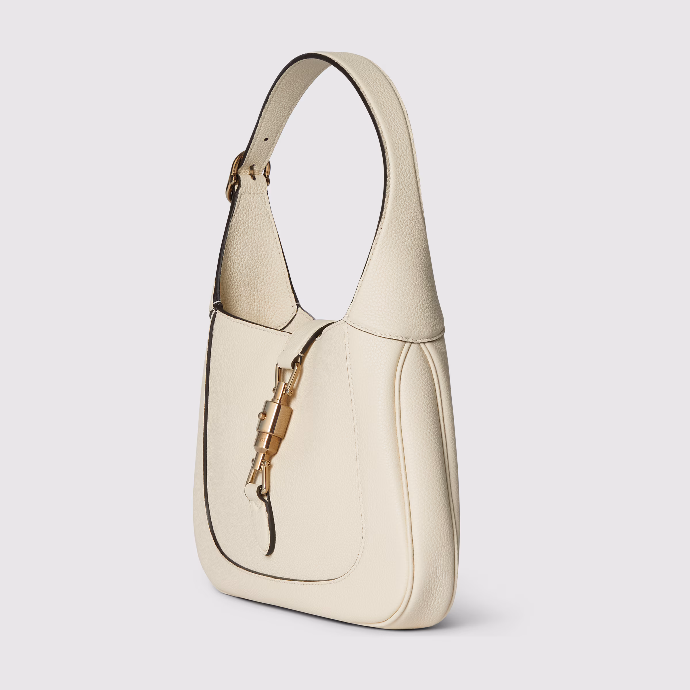 In the Fall Winter 2024 collection, the Gucci Jackie 1961 shoulder bag with new light gold-toned piston closure features fine ivory leather, highlighting the craftsmanship, crescent shape, and sleek silhouette of the House's iconic handbag. This small size comes with a leather strap and additional green and red Web strap for different styling options.