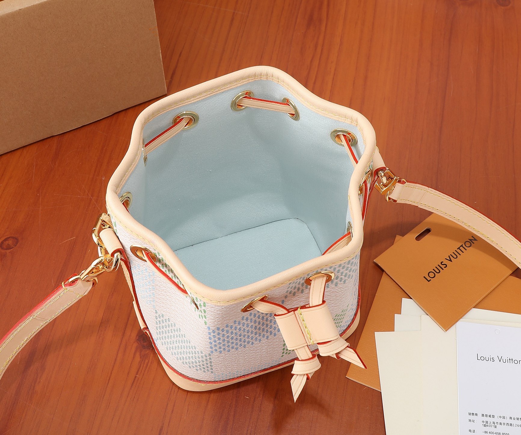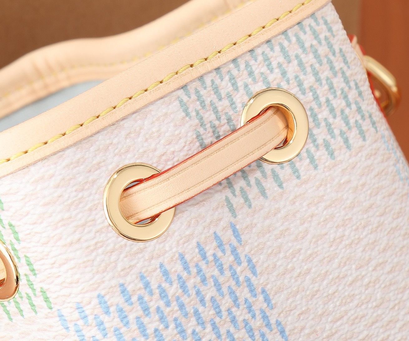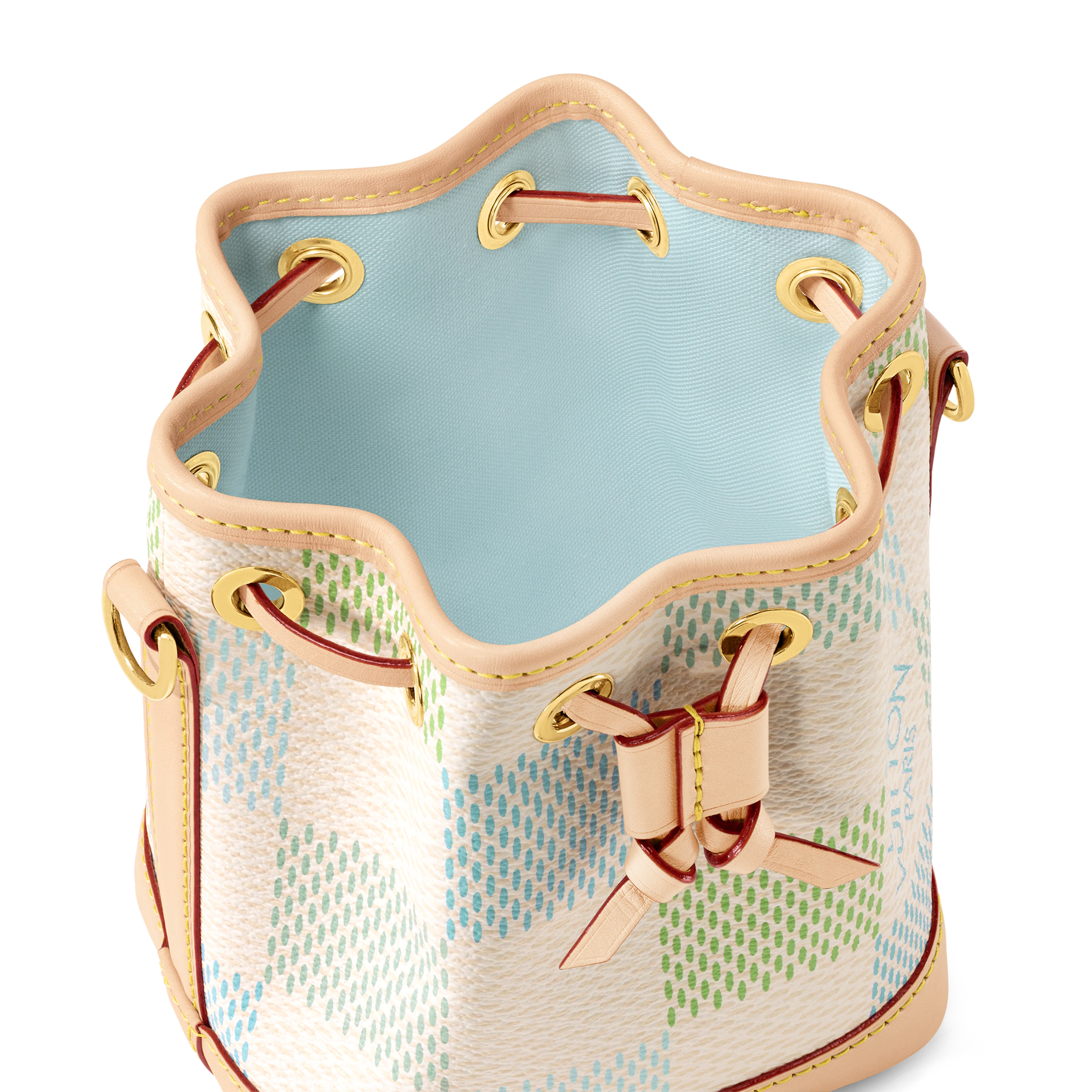 This special edition of the Nano Noé belongs to the Damierlicious collection, which reinterprets Damier canvas in luscious pastel shades. It brings a fresh, feminine feel to this mini replica of the iconic Noé bag, which is complemented by natural leather trim. The removable handle and removable, adjustable shoulder strap offer different carry options.