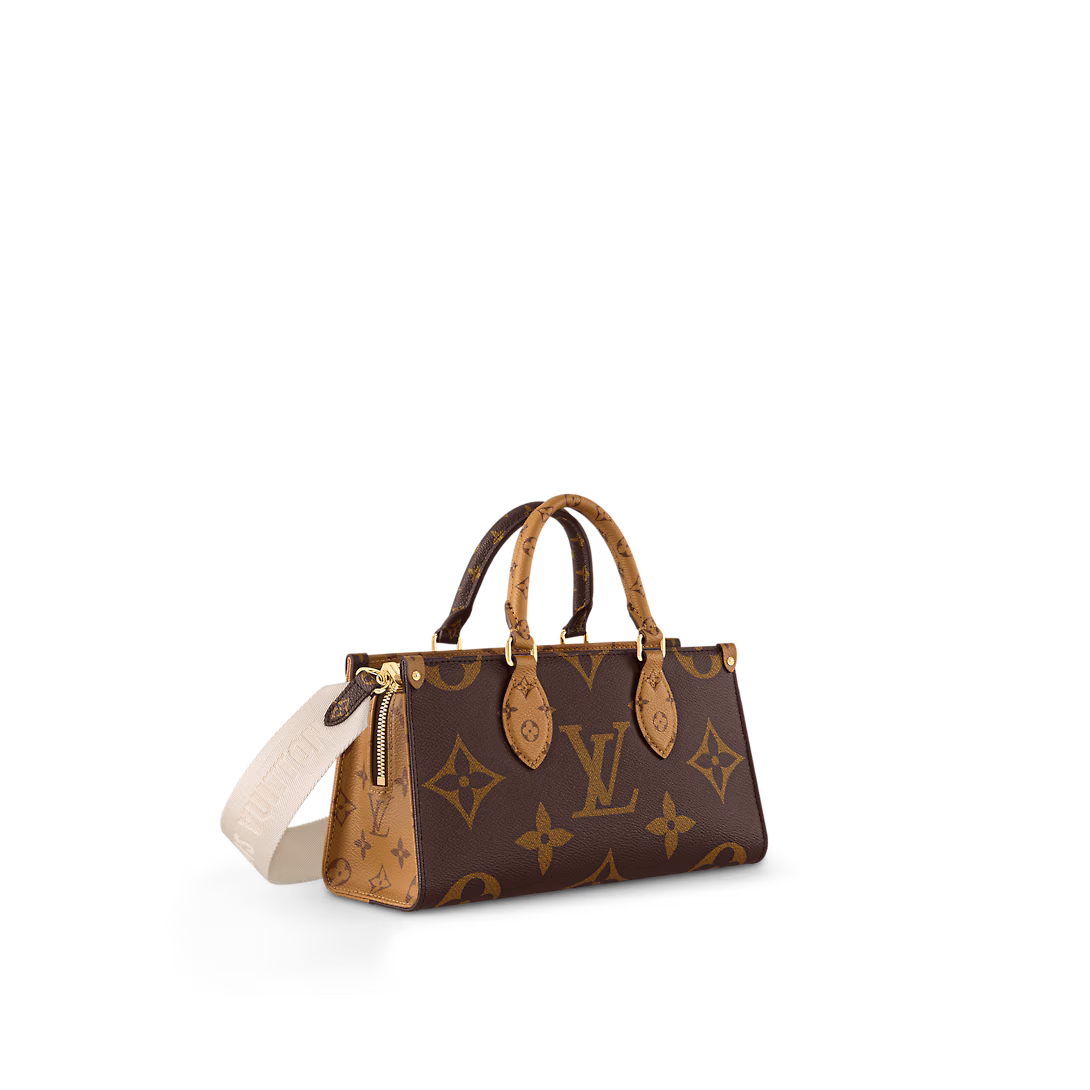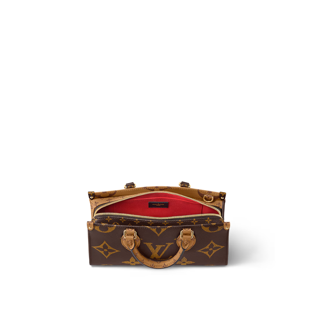 The Maison reinterprets the OnTheGo tote this season with a new east-west shape and a modern mix of Giant Monogram and Monogram Reverse canvas. Fitted with two Toron top handles and a wide, detachable strap, this beautifully proportioned bag can be styled in a variety of ways. A removable round coin purse completes this versatile design.
