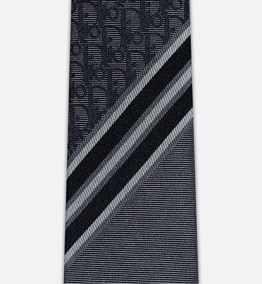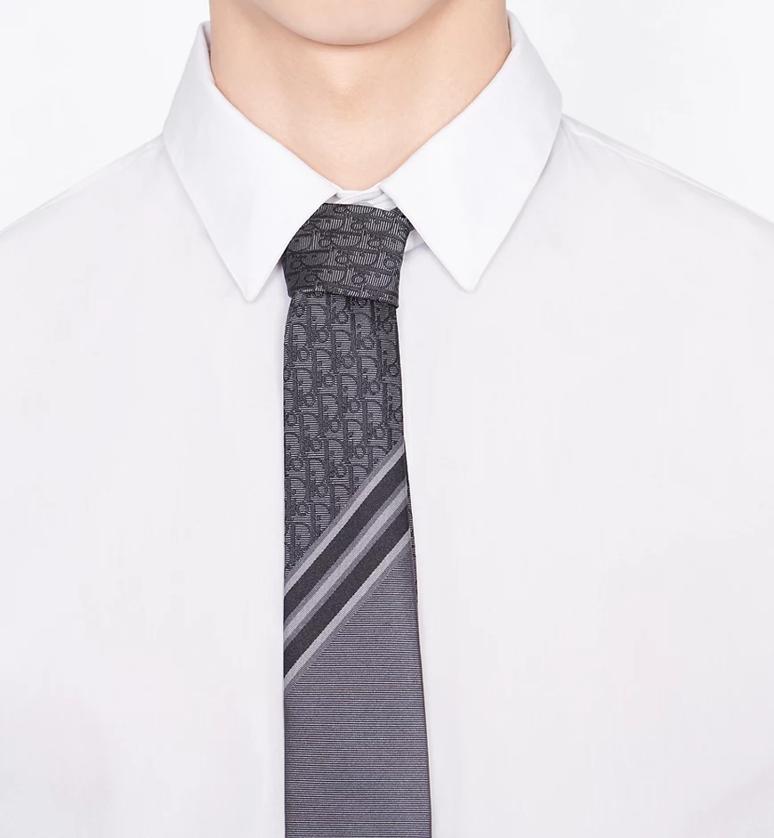 The gray silk tie is embellished with a Dior Oblique motif, further enhanced by gray and white jacquard stripes. Elegant and sophisticated, the tie lends a graphic touch to any suit.